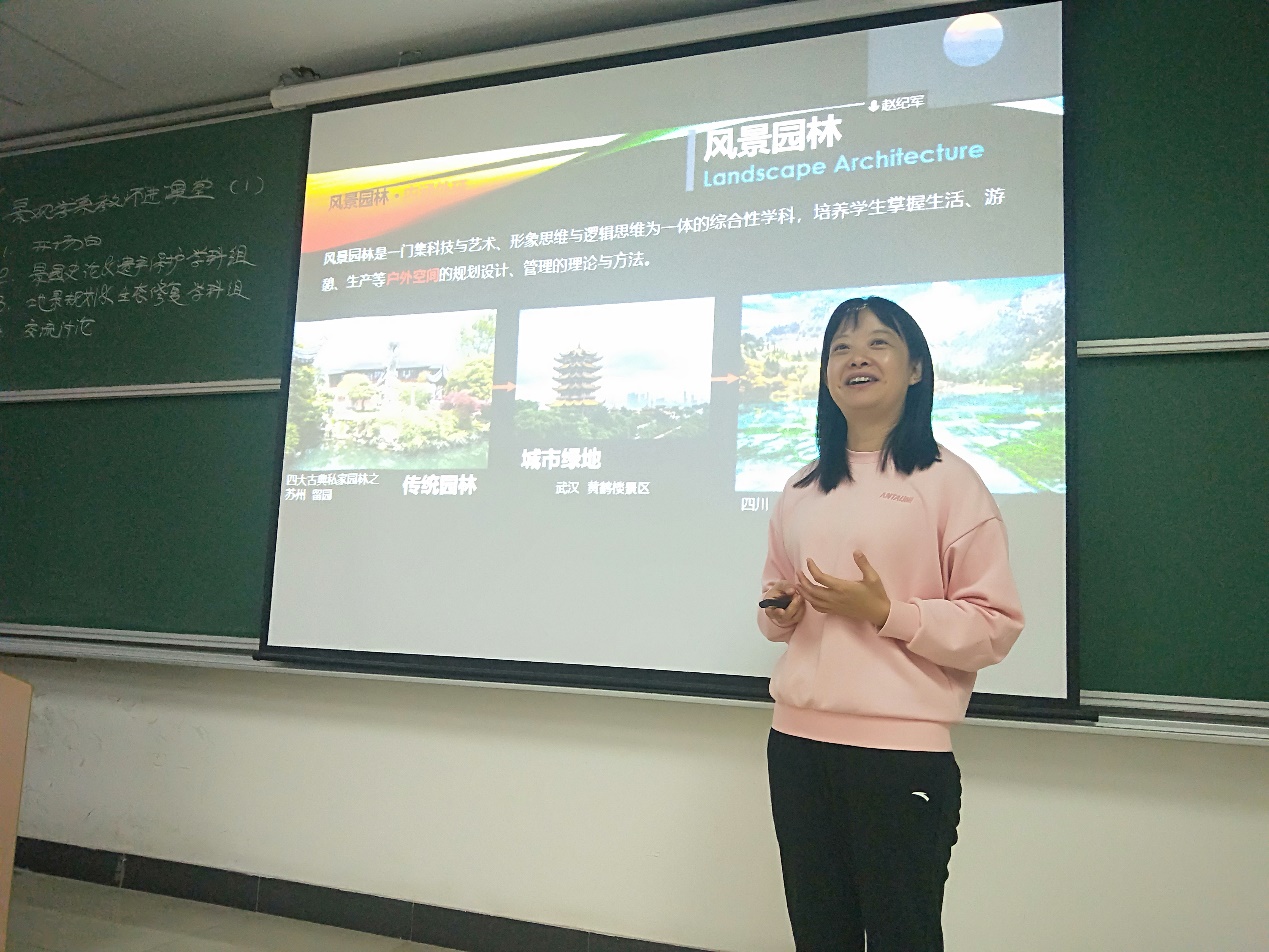 教学活动由殷利华老师主持,说明了本节课程的总体安排,并简要介绍景观学系的学科团队总体情况。第一节课,由“风景园林历史与理论”学科团队的赵纪军、王通、秦晴三位老师分别进行个人情况的介绍,第二节课,由“地景规划与生态修复”的戴菲、龚建、陈明三位老师分别介绍,最后由殷老师进行本次教学活动的总结。
