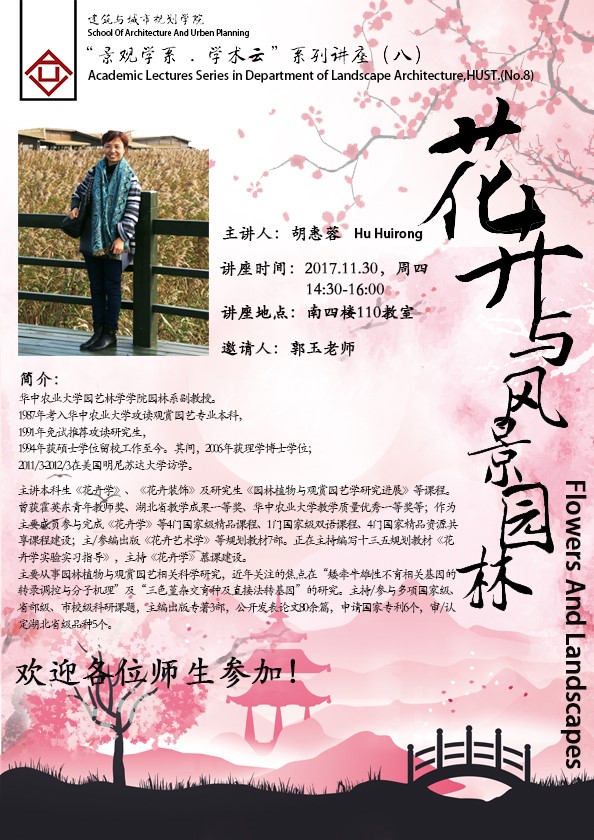 风景园林因为有了充满生机活力的植物,便具有了律动的生命、绚烂的色彩、丰富的情怀。2017年11月30日,下午14:30—16:30,南四楼110教室,在景观学系郭玉老师的邀请和主持下,华中农业大学的胡惠蓉副教授,从“花卉”角度,给我们带来了一场变化的、多样的、生命的、鲜活的、美丽的风景园林和人居环境的思考。