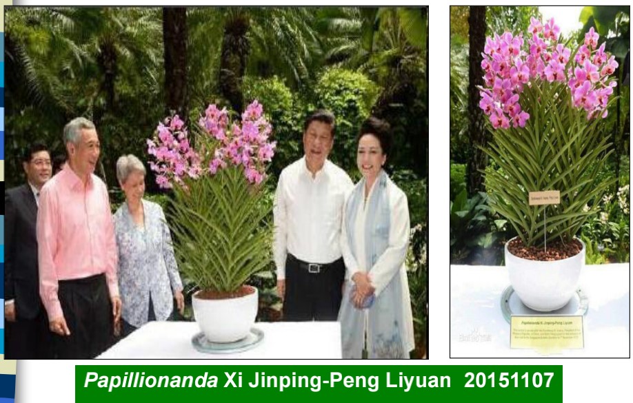 花卉与生活的关系密切。如一些花事活动如种花、插画、送花、赏花是人们与花卉接触最直接的方式。在中国古代与种花、买花相关的记录有很多,在白居易的诗《买花-牡丹》中就描写了唐代卖花郞与买花人的形象。插花在中国传统文化中也有非常重要的地位,诗“清明不插柳,红颜成皓首”等表现了这一文化。湖北有一位非常有名的花艺家袁宏道,其著《瓶史》传入日本,对日本花道影响非常大,后来形成一个流派为“宏道流”。赏花中,胡老师介绍了与花的互动的趣味性。例如金鱼草,捏住其花筒,可使其唇瓣打开。还有随意草、凤仙花、西番莲、捕蝇草、随手香等,这些花可以为人们带来不只是观看的更加别样的体验。中国最早关于送花的记录来自《诗经》。离别时“赠之以芍药”,因此将离为芍药的别称;古代闺怨女子寄给丈夫的当归等,都是赠花与文化的经典例子。在现代,国家与国家之间赠花并命名甚至成为国家之间交往的礼仪。例如新加坡赠给习总书记的兰花,其名称为Papillionanda Xi Jingping-Peng Liyuan(图15)。