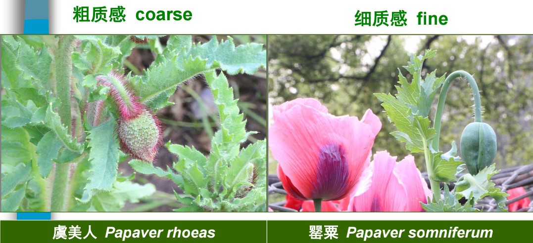胡老师告诉我们,植物的质感设计不容易掌握,但也是最能触动人心的部分。粗质感”植物有拂子茅、黑心菊、水飞蓟等;“细质感”植物如观赏草苔草、多肉植物。质感甚至能帮我们判别植物类别,避免触犯法律,如同科同属的虞美人植株表面有较长较密的刚毛,而罂粟表面是光滑(图13)。